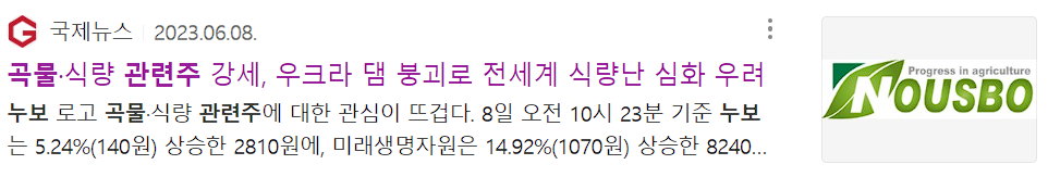 | 곡물식량주 강세, 우크라 댐 붕괴로 전세계 식량난 심화 우려(국제뉴스, 2023.06.08) |