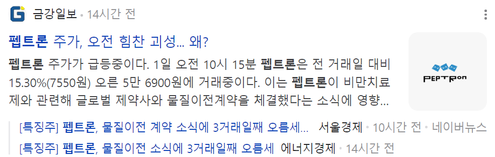 - 펩트론 : 비만치료제 시장 확대 전망 등에 비만치료제 테마 상승 속 급등