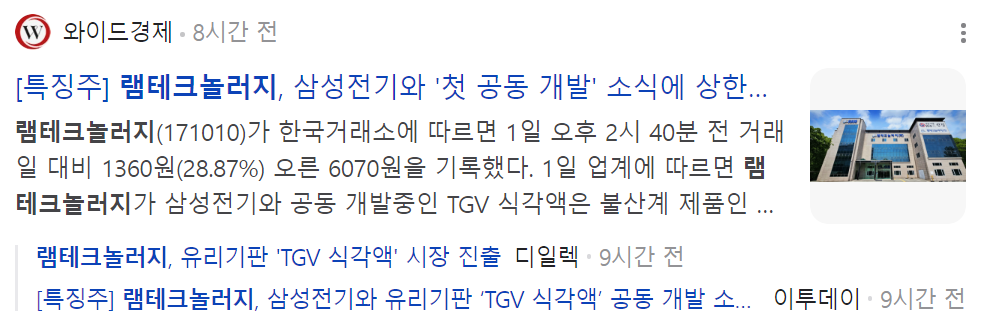 - 램테크놀러지 : 반도체 관련주 상승 속 삼성전기와 TGV 식각액 공동개발 소식 등에 급등