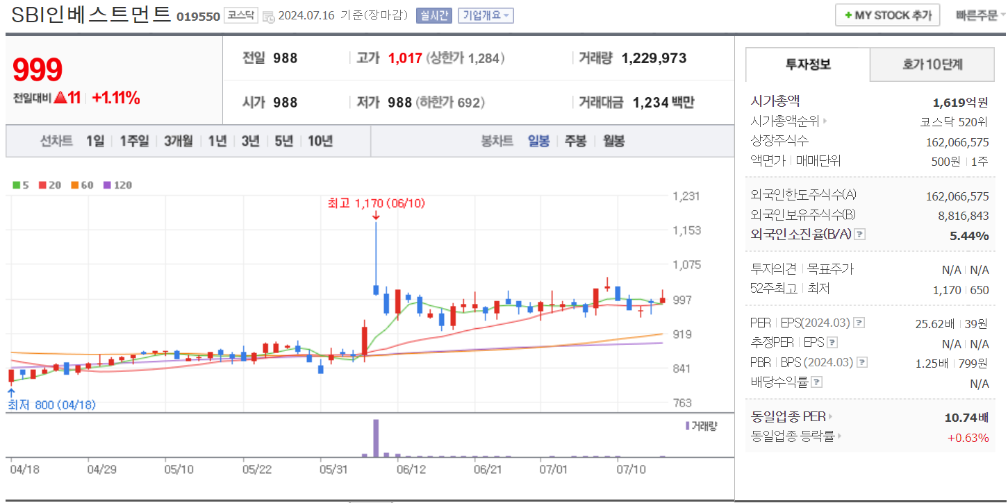야놀자 상장 관련주 :  SBI인베스트먼트(019550)