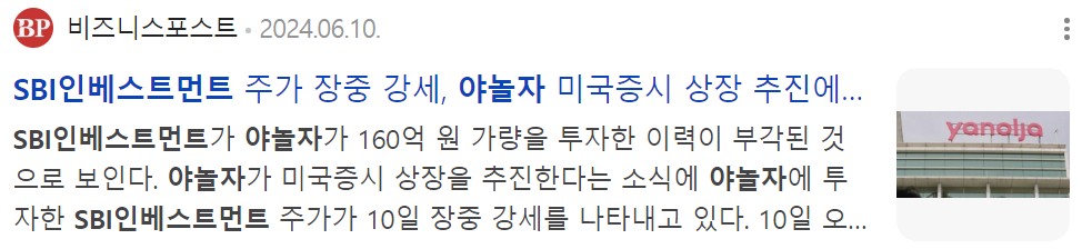 SBI인베스트먼트는 야놀자에 160억 원을 투자한 것으로 알려져 야놀자 상장 관련주로 꼽힙니다.
