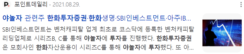한화투자증권은 자회자인 한화자산운용이 2018년에 야놀자에 400억 원을 투자하여 야놀자 상장 관련주로 꼽힙니다.