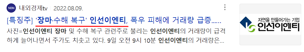 폐기물업체인 인선이엔티는 장마 및 수해 복구주로 장마 태풍의 대표적인 관련주입니다.