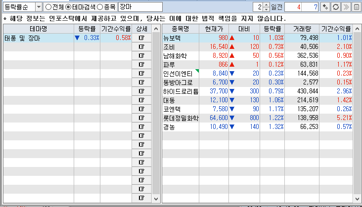 본격적인 장마철에 접어들면 장마철 수혜주로 농약, 비료, 제습기업체가 주가가 들썩이게 됩니다. 키움증권 인포스탁섹터종목을 기초로 태풍 및 장마테마 관련 종목을 몇 종목 알아보겠습니다.