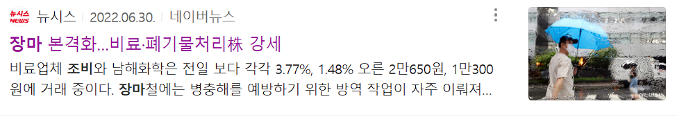 비료업체 조비도 장마철이 본격화 되면 방역 작업에 약제 수요가 늘어나게 됩니다. 농작물은 비료를 사용회 장마로 피해 본 농작물을 회복시키기 때문에 비료 수요가 늘어나게 매년 장마시즌이 찾아오면 장마 관련주로 거론됩니다.