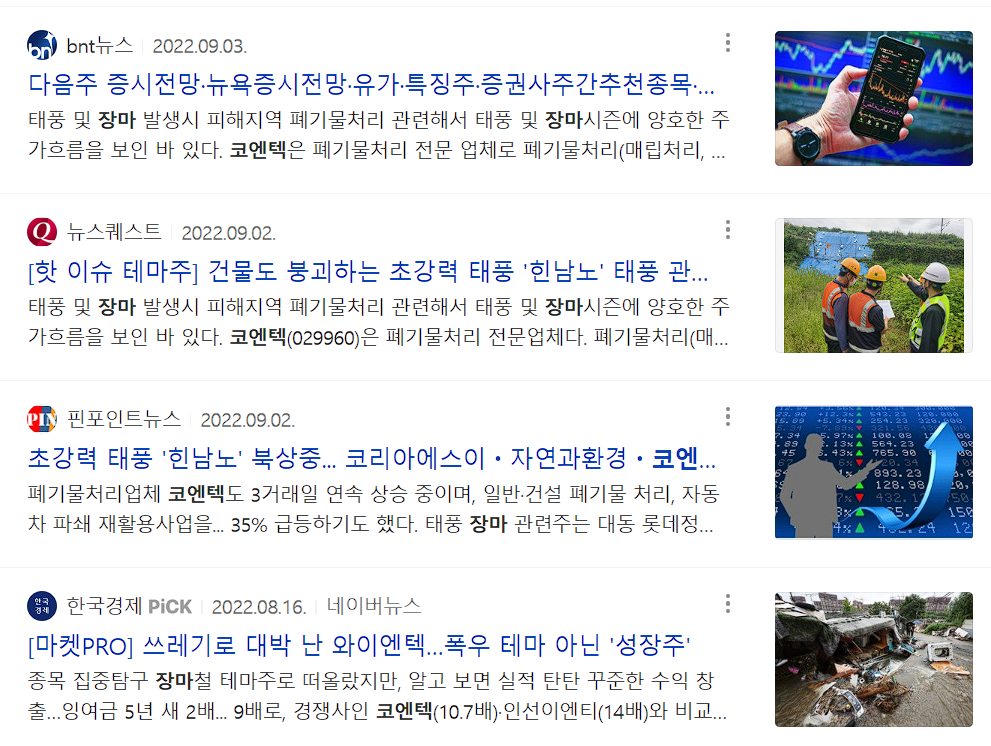 산업폐기물 처리업체인 코엔텍도 태풍 장마 관련주로 태풍 및 장마시즌에는 양호한 주가흐름을 보인바 있습니다.