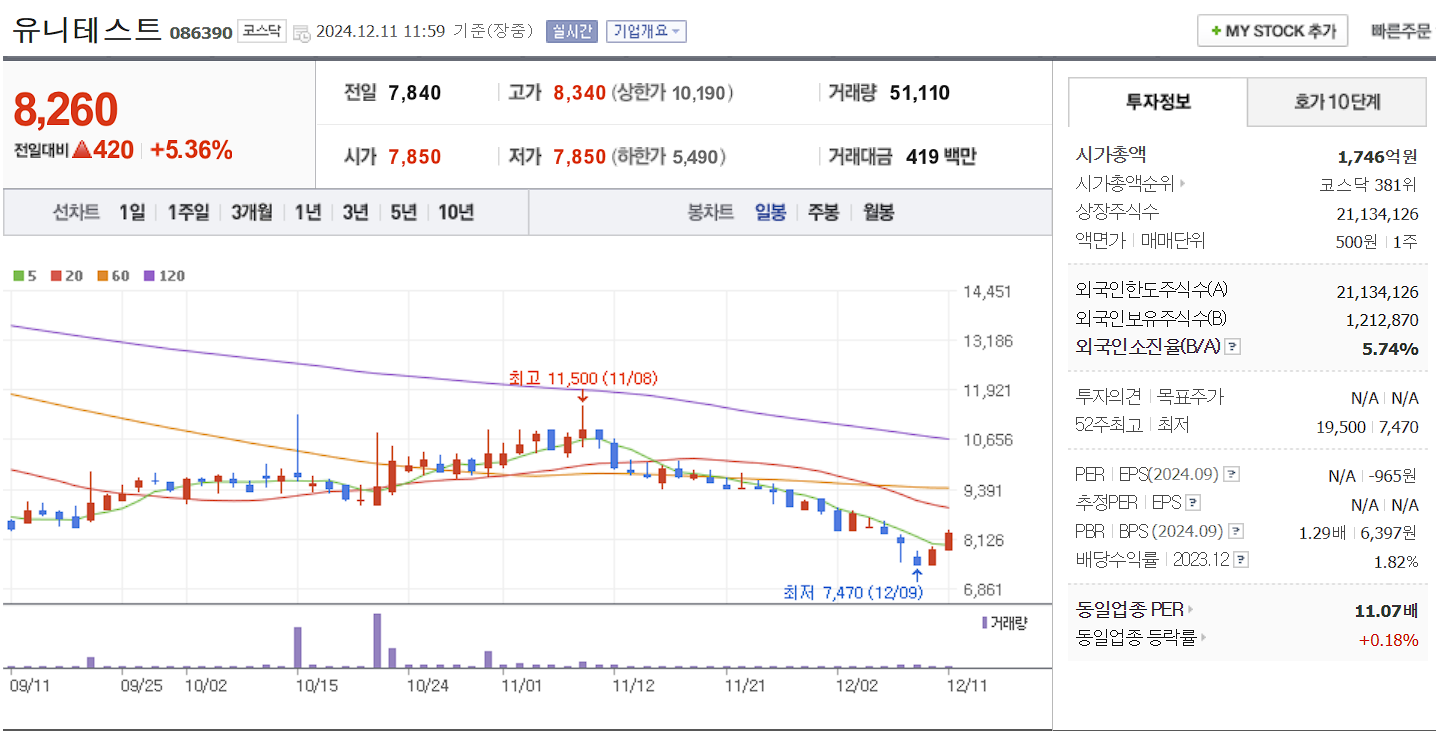 유니테스트는 반도체 테스트 장비 제조업체로, 초전도체와 관련된 페로브스카이트 태양전지 상용화를 추진하고 있습니다.