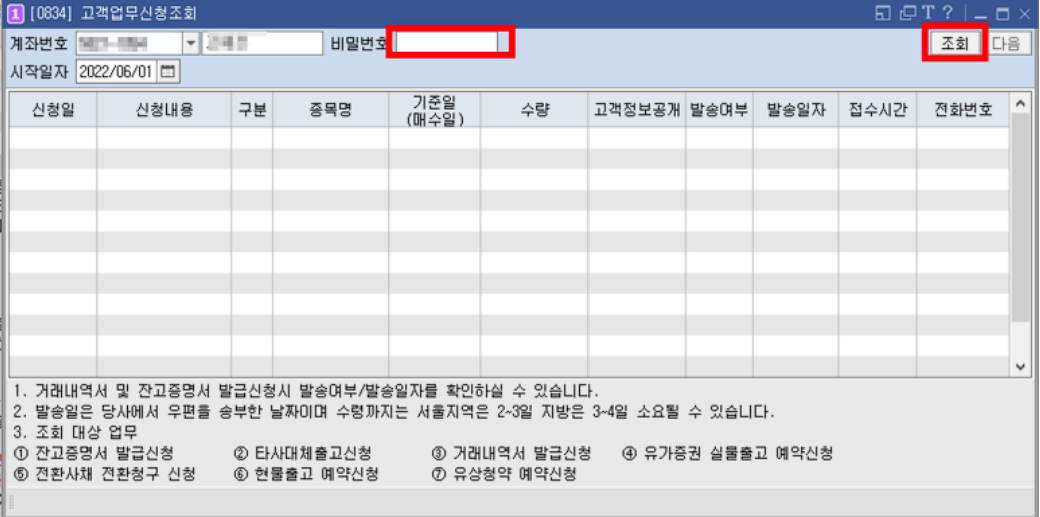 •방법: 타사대체출고 창(0836)에서 신청내역 조회를 클릭하거나, 창번호 0834(고객업무신청조회)를 입력해 확인합니다. 신청한 계좌를 선택하고, 계좌 비밀번호를 입력한 후 조회 버튼을 누르면 내역을 확인할 수 있습니다.