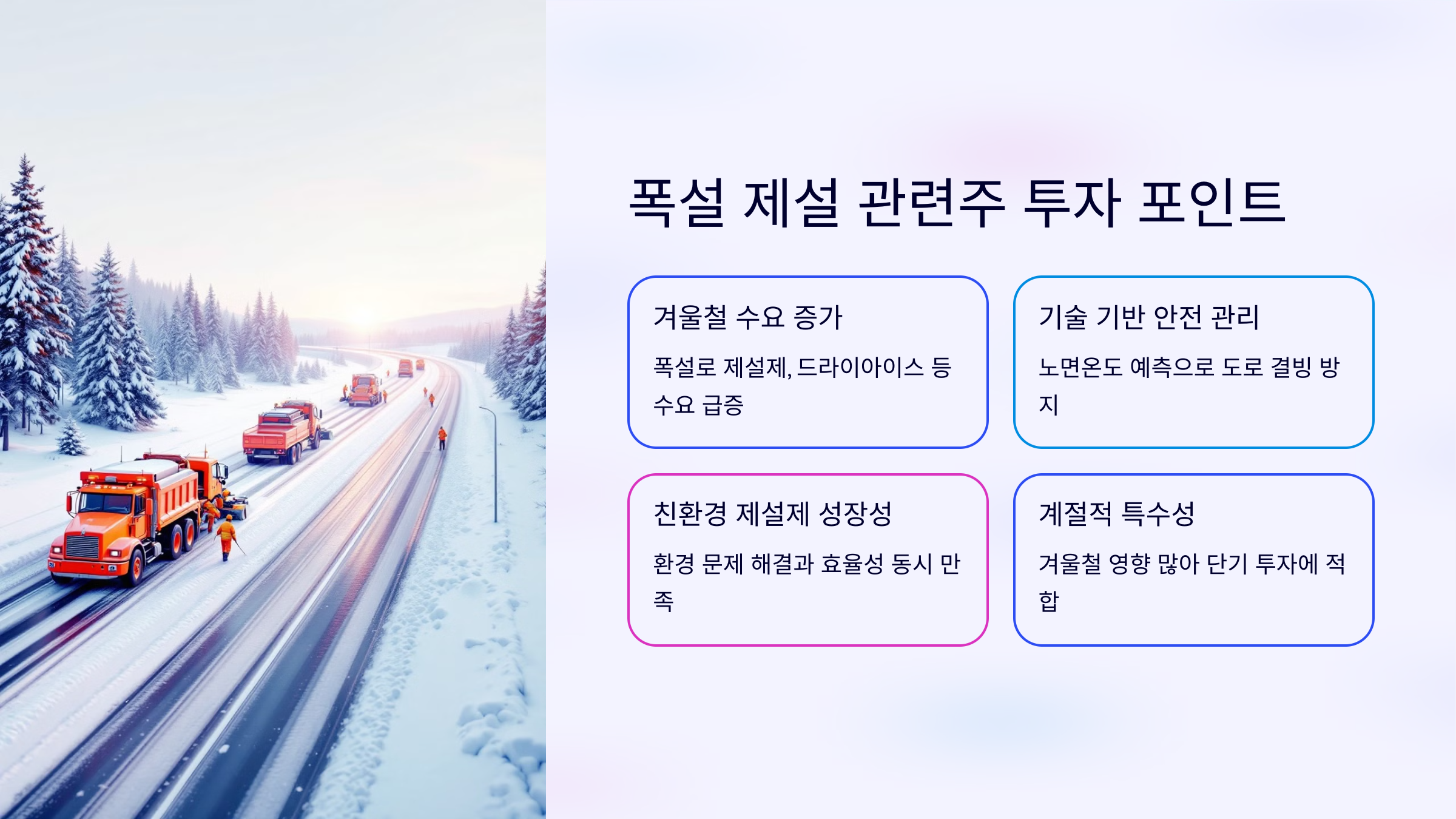 폭설과 한파는 겨울철 주요 투자 기회로 작용하며, 드라이아이스, 제설제, 도로 안전 기술을 중심으로 한 기업들이 수혜를 받을 가능성이 큽니다.