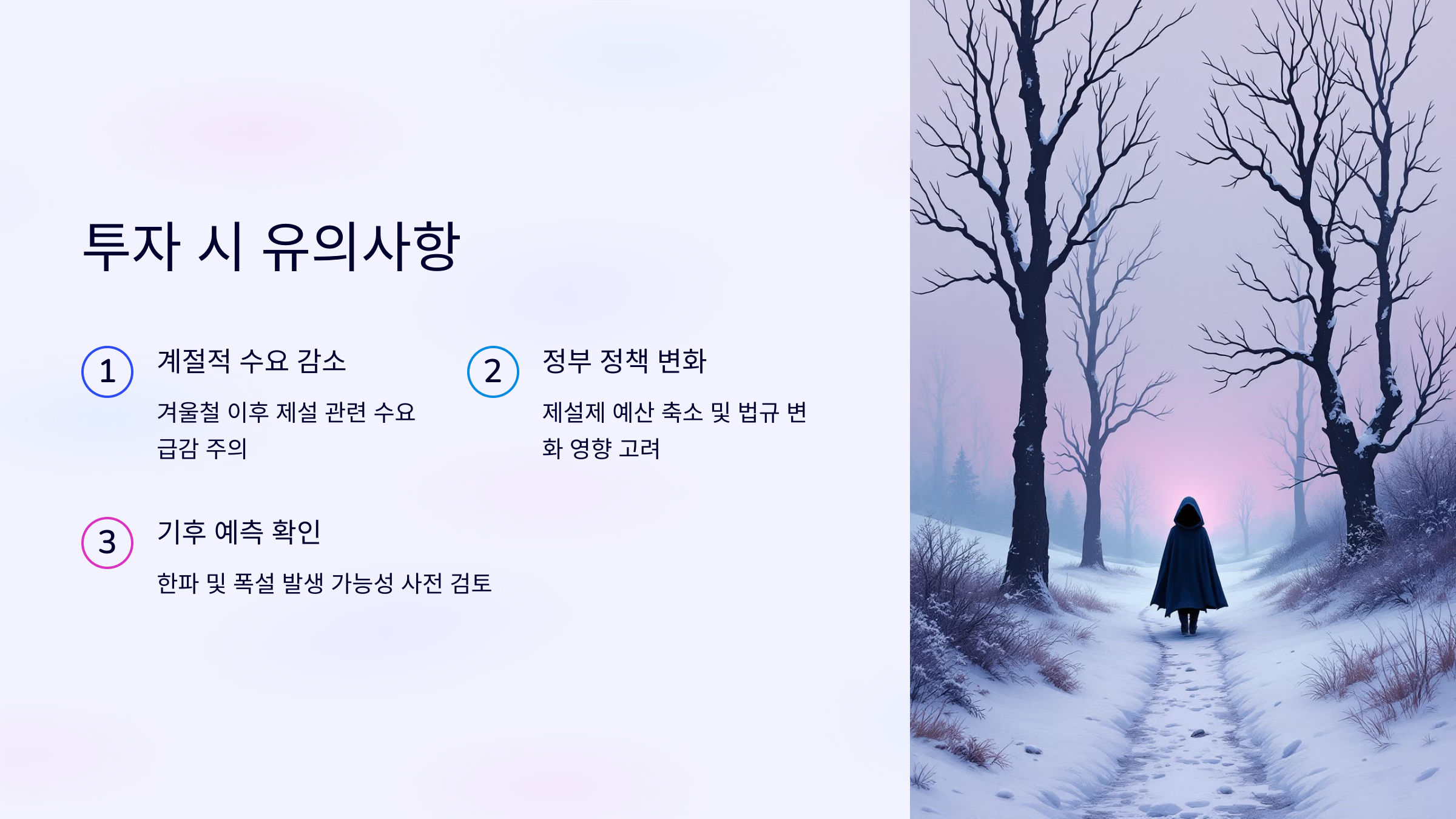 투자 전 기상청의 한파 및 폭설 예보를 확인하고 실제 발생 가능성을 고려해야 합니다.