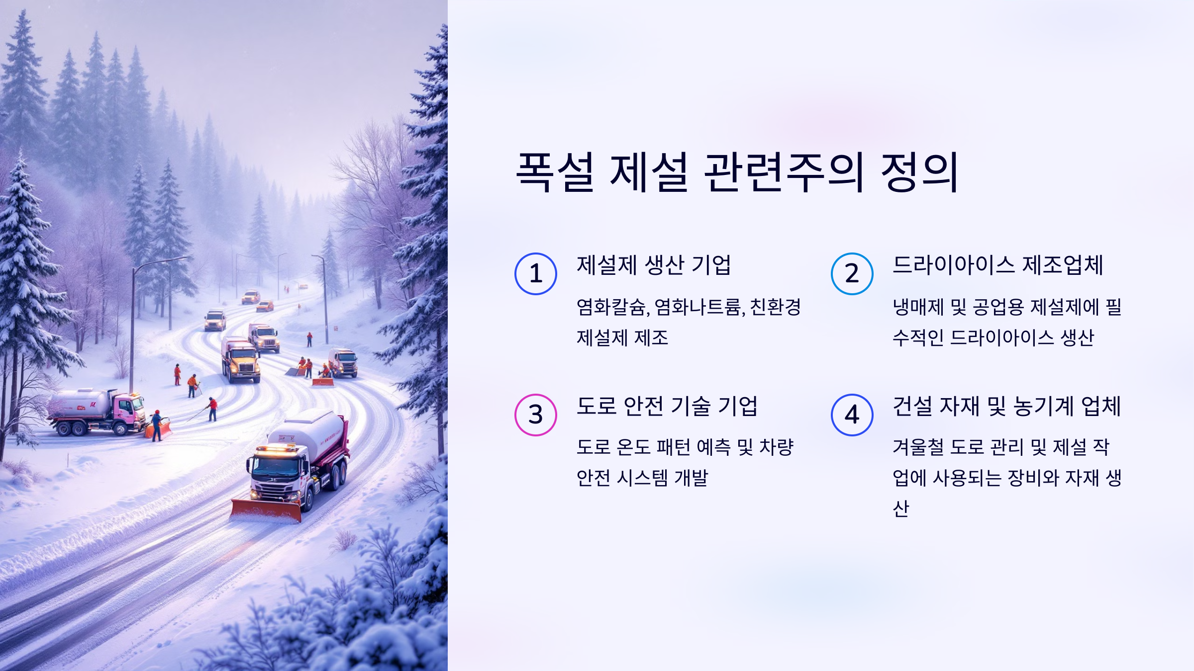 •제설제 생산기업: 염화칼슘, 염화마그네슘, 친환경 제설제 등을 제조하는 기업.