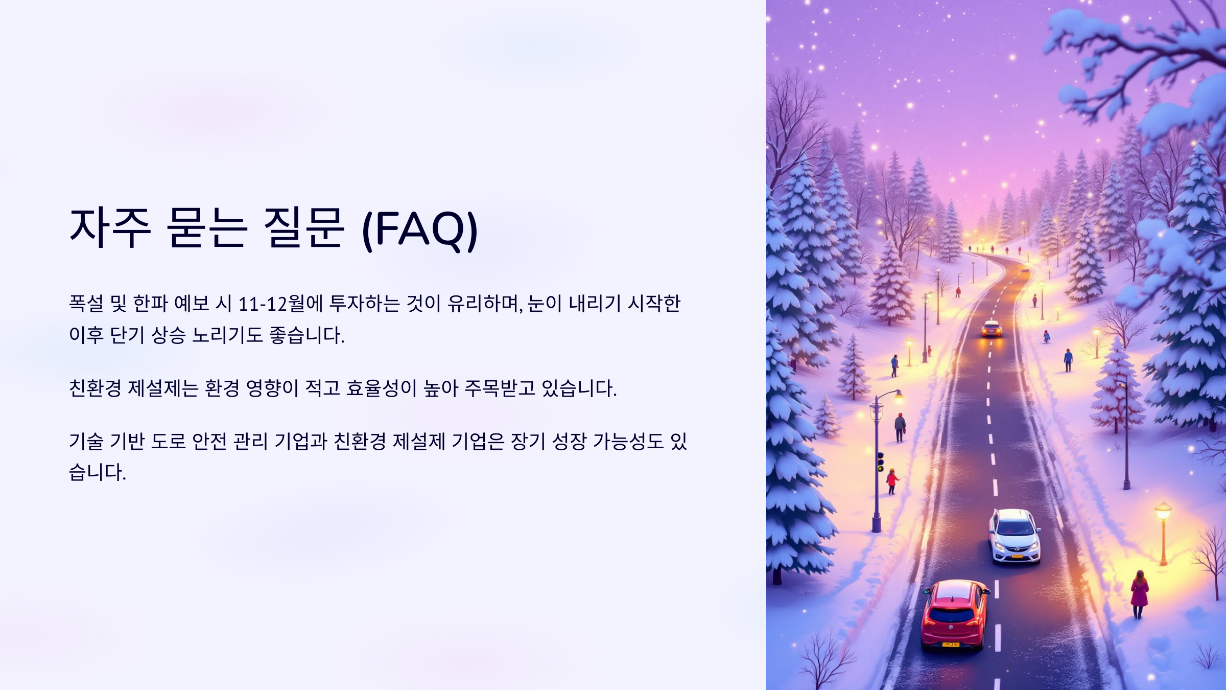 A. 대체로 단기 투자가 적합하지만, 기술 기반 도로 안전 관리 기업이나 친환경 제설제 기업은 장기적인 성장 가능성도 있습니다.